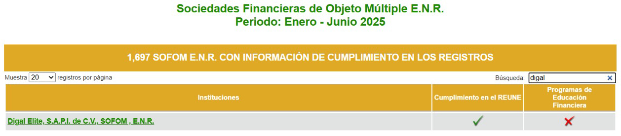 DIGAL ELITE S.A.P.I. de C.V. SOFOM ENR en el Buro de Entidades Financieras.